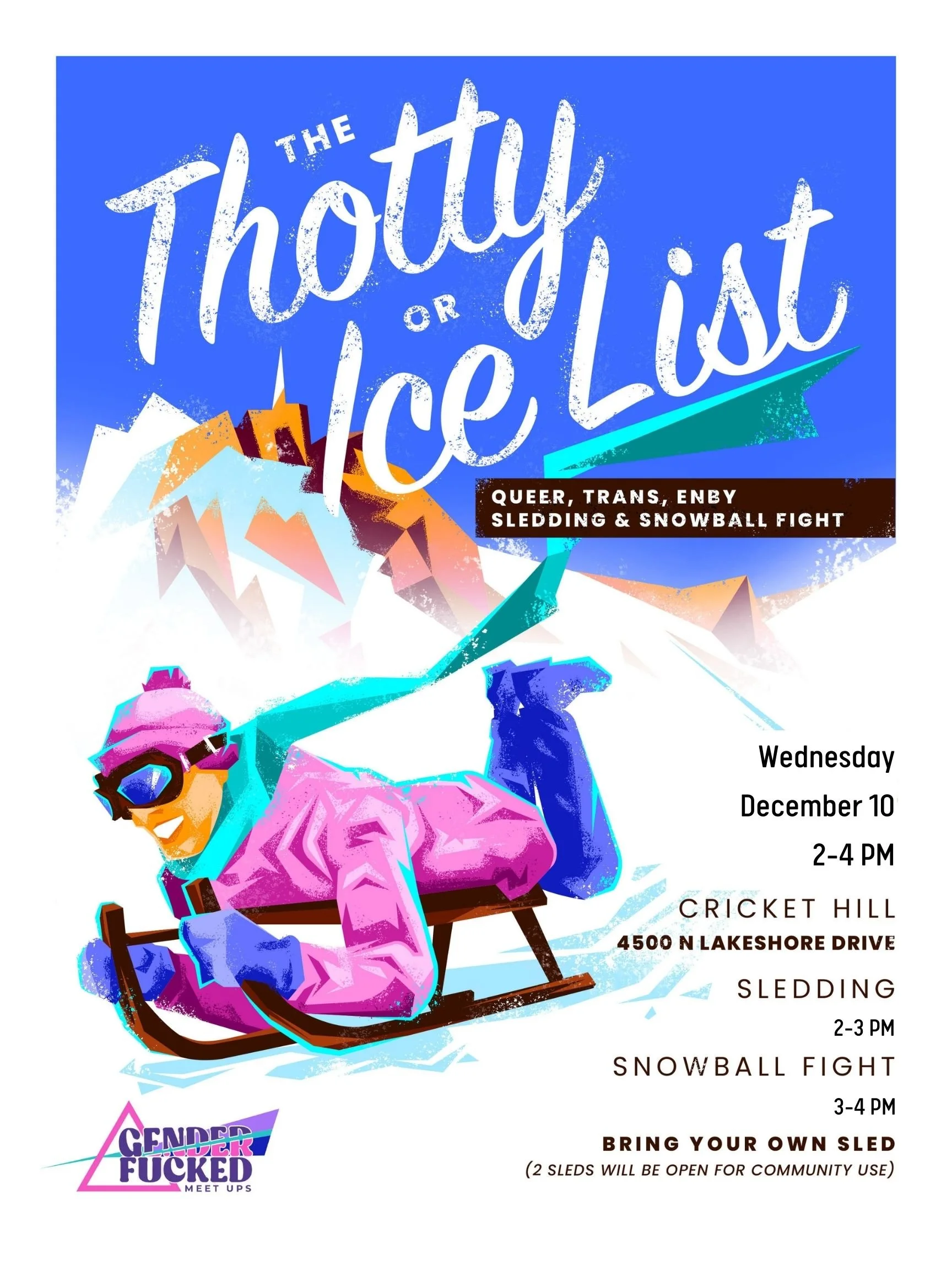 Come to the Thotty or Ice List this Thursday 12/10 at 2-4 PM. We will start with sledding at 2 PM and prep for our snowball fight at 3 PM. Gathering will be at the top of Cricket Hill near Montrose Beach! Be there or be chilly. Make sure to bring your own sled. We will have 2 sleds to share but the more the merrier.